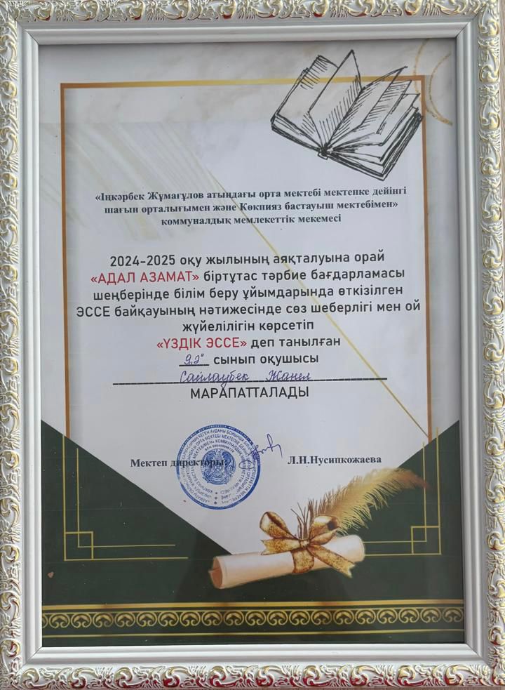 Алматы облысы,Кеген ауданы “Іңкәрбек Жұмағұлов атындағы орта мектебі мектепке дейінгі шағын орталығымен және Көкпияз бастауыш мектебімен”комуналдық мемлекеттік мекемесінде “Адал Азамат” Біртұтас тәрбие бағдарламасы шеңберінде білім беру ұйымдарында өтікізілетін эссе байқауы бойынша