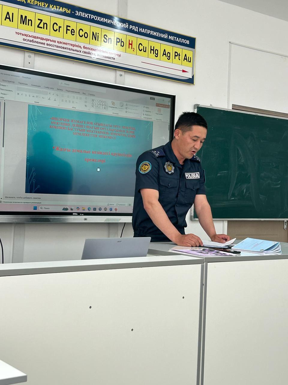 “Іңкәрбек Жұмағұлов атындағы орта мектебі, мектепке дейінгі шағын орталығымен және Көкпияз бастауыш мектебімен” коммуналдық мемлекеттік мекемесінде УПИ полиция аға лейтенанты Шаймерден Өмірсерік Талғатұлы және Кеген ауданы ПБ ЮПТ инспекторы полиция аға лейтенанты Жәйшібек Мадиярдың қатысуымен